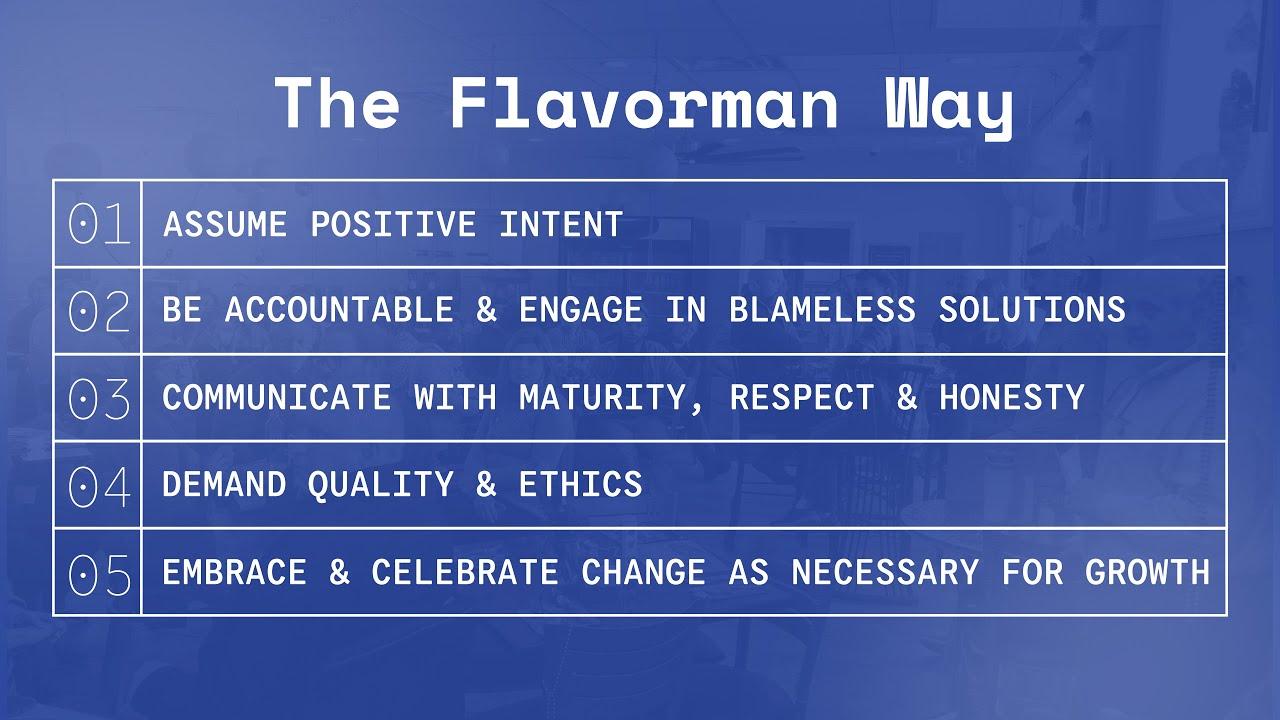 The Flavorman Way is a set of guiding principles that define and shape how we communicate, behave, and interact internally so that we can be at our best externally.